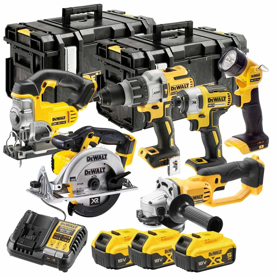 The DeWalt DCK694P3 XR 18V Brushless 6 Piece Kit contains the DCD996N Hammer Drill, DCF887N Impact Driver, DCS391 Circular Saw, DCG412N 5" Angle Grinder, DCS331 Jigsaw and the DCL040 Torch. This tool kit also comes supplied with 3 x 5.0Ah Slide Pack Batteries, Multi Voltage charger and 2 x DS300 Tough System Kit Box.